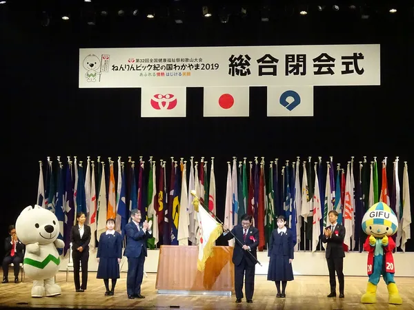 全出演者と客席が一体となり、「上を向いて歩こう」を合唱して迎えたフィナーレ。「あふれる情熱はじける笑顔」に幕を閉じ、次期開催地岐阜県に引き継がれます。